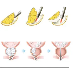 HoLEP unblocks the prostate by separation of the enlarged glandular prostate tissue from the fibrous peripheral covering of the prostate. This is done under a general anesthetic with a telescope through the penis. There are no incisions made in the skin. The obstructing prostate tissue is detached from the peripheral part of the prostate as shown below, and is pushed into the bladder. This is often compared to “peeling an orange from the inside”. A special instrument called a morcellator is then inserted through the telescope, and used to break up and suction out the tissue in pieces. The pieces are then sent for biopsy. A catheter is placed into the bladder to drain urine and allow for comfort for about one day.