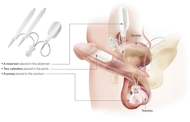 The Inflatable Penile Prosthesis (IPP) is a penile implant to treat erectile dysfunction, and sometimes Peyronie’s disease. The implant consists of a cylinder or two in the penis, a pump placed inside your scrotum (near your testicles), and a reservoir of saline (salt water solution) in your lower abdomen. Squeezing the pump in your scrotum moves the saline into the cylinders which creates a rigid erection that feels very natural. The erection stays for as long as you desire, so even after climax, the implant will stay inflated. When you are finished using the implant, there is a deflate button on the pump that returns the penis to a flaccid, soft state.